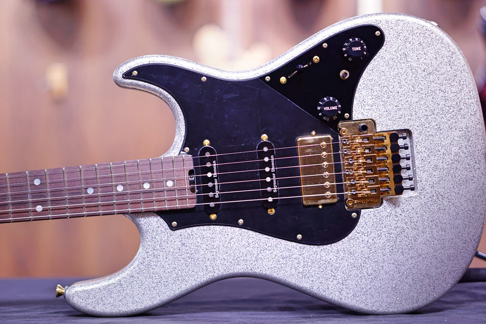 ESP Original SNAPPER FR w kolorze Srebrny Połysk to najwyższej jakości gitara elektryczna wyprodukowana w Japonii, zaprojektowana dla wymagających muzyków poszukujących wyjątkowej grywalności i brzmienia. Jej korpus z olchy w połączeniu z twardą szyjką klonową o smukłym kształcie „U” i podstrunnicą z palisandru honduraskiego o promieniu złożonym (240–305 mm) zapewnia zarówno wygodę, jak i wszechstronność w różnych stylach gry. Menzura 648 mm i 22 progi JESCAR FW55090-NS ułatwiają łatwą grę. Wyposażona w przetworniki Seymour Duncan — STK-S6 w pozycjach gryfu i środkowej oraz TB-14 w mostku — zapewnia dynamiczny i ekspresyjny zakres tonalny. Mostek Floyd Rose, uzupełniony kluczami Gotoh SG360-07 MG-T, zapewnia stabilne strojenie i precyzyjną akcję tremolo. Estetycznie wykończenie Silver Sparkle dodaje uderzającego uroku wizualnego, dzięki czemu jest to wyjątkowy wybór dla profesjonalnych gitarzystów.