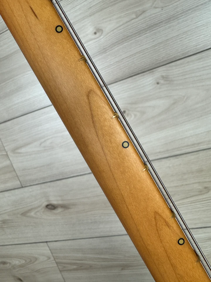 - 6-siodłowy mostek Hardtail z 6 strunami przechodzącymi przez korpus z chromowanymi Brass Saddles
