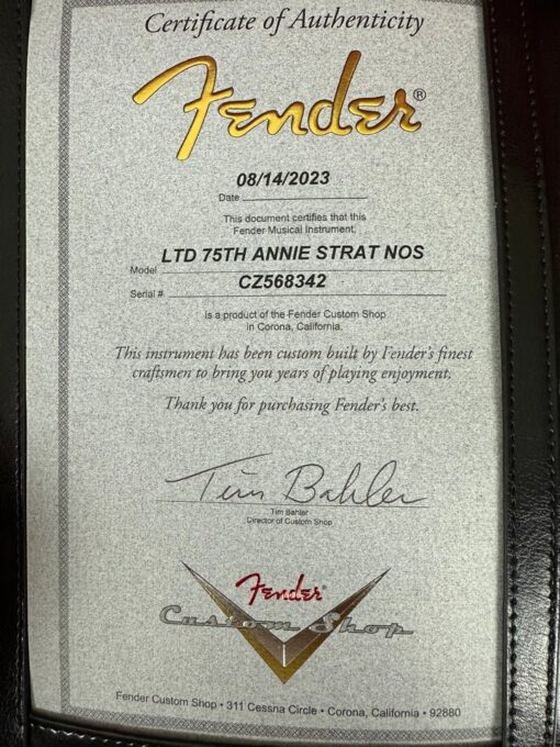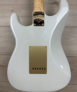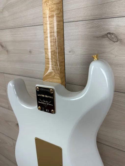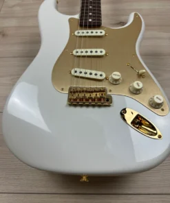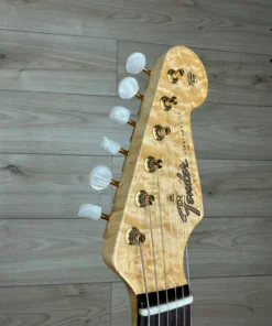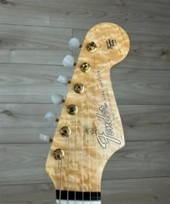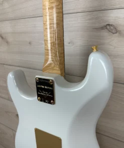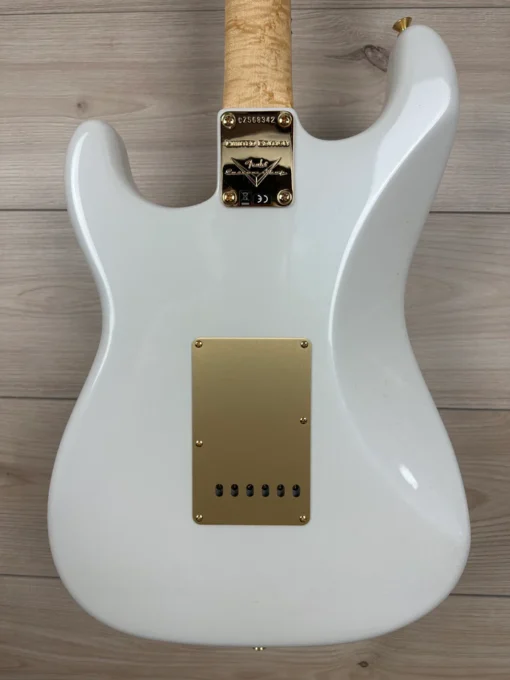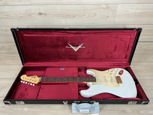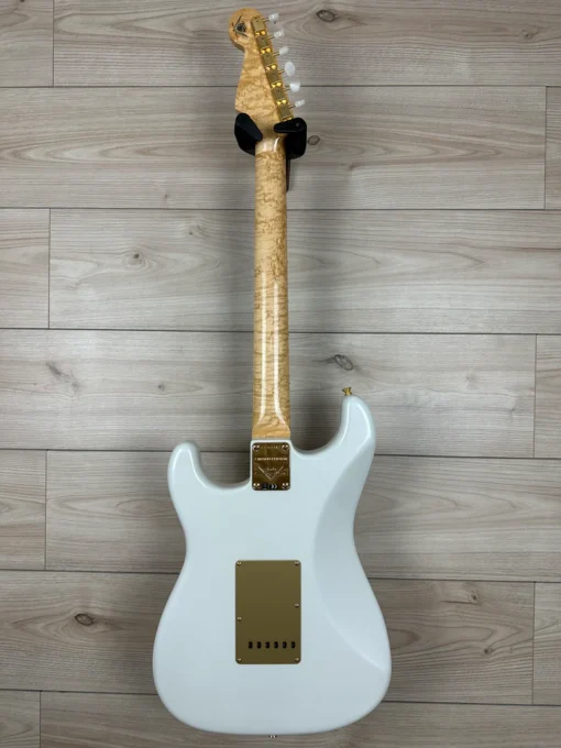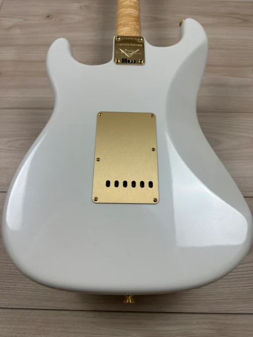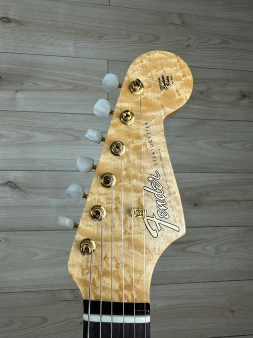 Dwuczęściowy korpus z wyselekcjonowanej olchy wykończony jest dekadenckim lakierem nitrocelulozowym „Diamond Pearl”. Lekko przyciemniany gryf z klonu ptasiego oka 5A, cięty ćwiartkami, ma profil „owalnego C” z lat 60. i zwieńczony jest podstrunnicą z palisandru okrągłego z wąskimi, wysokimi progami, perłowymi kropkami na powierzchni i cyrkoniami sześciennymi na bokach. Ośmiootworowa, anodowana na złoto płytka ochronna mieści trzy ręcznie nawijane przetworniki Fat ’60s (z odwrotnym nawijaniem/odwrotną polaryzacją na środku), pięciopozycyjne przełączanie i okablowanie Fat ’50s Strat dla uzyskania mocnego brzmienia z przezroczystym rozkwitem. Inne funkcje obejmują tremolo Custom Shop vintage zsynchronizowane, klucze w stylu vintage z perłowymi guzikami, nakrętkę z kości i „skrzydłowy” drzewko strun z metalowym dystansem. Zawiera luksusowy futerał, pasek i certyfikat autentyczności.