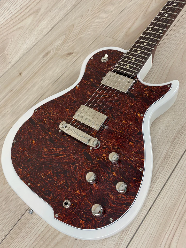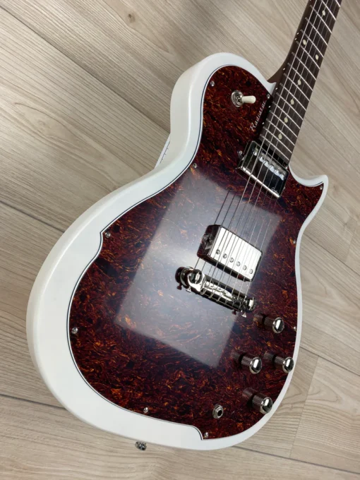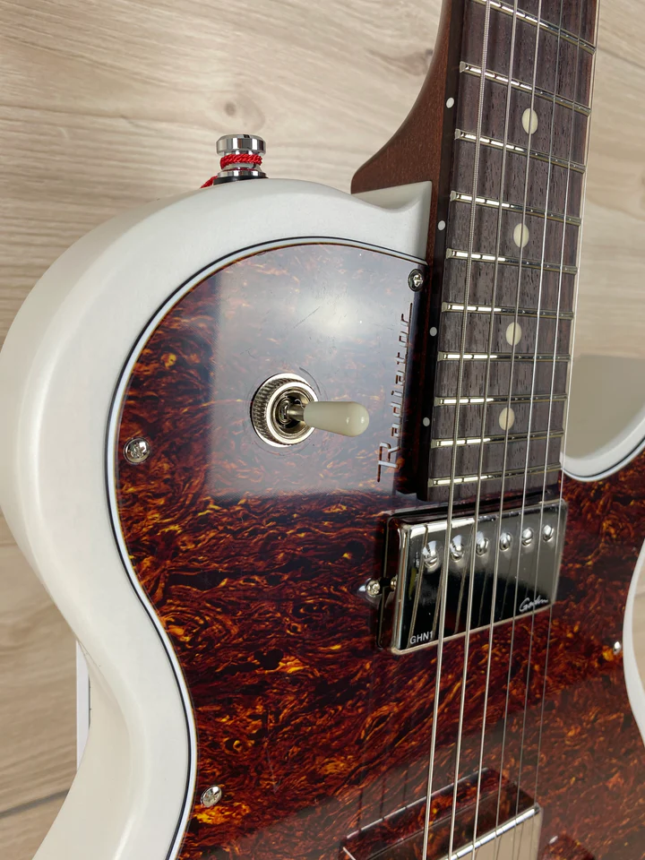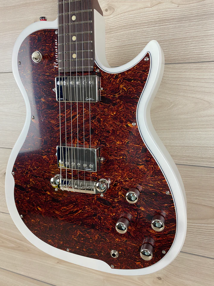 Gitara elektryczna Godin 048458 Radiator RN w kolorze Trans Cream to kanadyjski instrument łączący nowoczesny design z wyjątkową grywalnością. Posiada korpus i gryf z klonu srebrzystego, uzupełnione gładką podstrunnicą z palisandru. Wyposażona w niestandardowe przetworniki humbucker Godin, gitara ta zapewnia wszechstronny dźwięk odpowiedni do różnych stylów muzycznych. Krótki gryf zwiększa komfort, dzięki czemu jest idealna zarówno dla początkujących, jak i doświadczonych graczy. Dopasowana płytka ochronna i główka dodają jej elegancji. Ten model jest dostarczany z pokrowcem, co ułatwia transport.